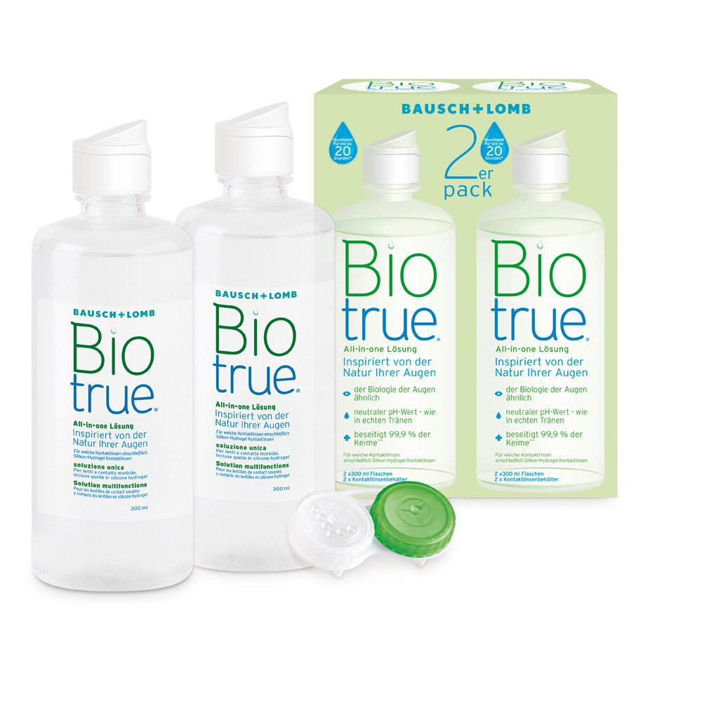 Biotrue™ All-in-one Pflegemittel ist speziell für die Reinigung, Desinfektion und Benetzung aller weichen Kontaktlinsen entwickelt worden, einschließlich Silikon-Hydrogel-Linsen.